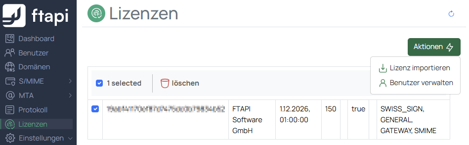 Sie können eine Lizenz über die Seite Lizenzen -> Aktionen -> Lizenz importieren hinzufügen. Nachdem Sie die von Ihrem Anbieter oder Support-Team bereitgestellte Lizenzdatei hochgeladen haben, validiert das System diese und zeigt an, ob sie akzeptiert wurde.