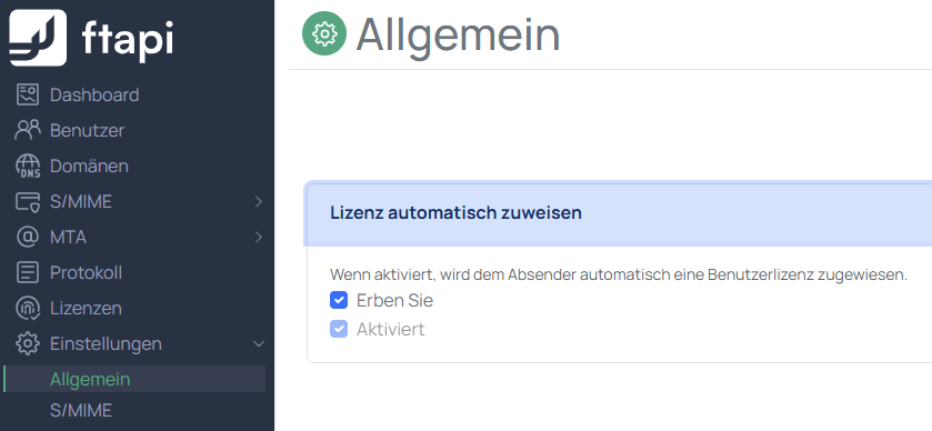 Wenn diese Option aktiviert ist und noch Benutzerlizenzen verfügbar sind, weist das Gateway einem Absender automatisch eine Lizenz zu, sobald dieser zum ersten Mal eine Verschlüsselung auslöst. Sind bereits alle Lizenzen belegt, können keine weiteren Absender automatisch lizenziert werden; in diesem Fall müssen Sie Lizenzen freigeben, indem Sie diese von inaktiven Benutzern entfernen, oder zusätzliche Lizenzen installieren.