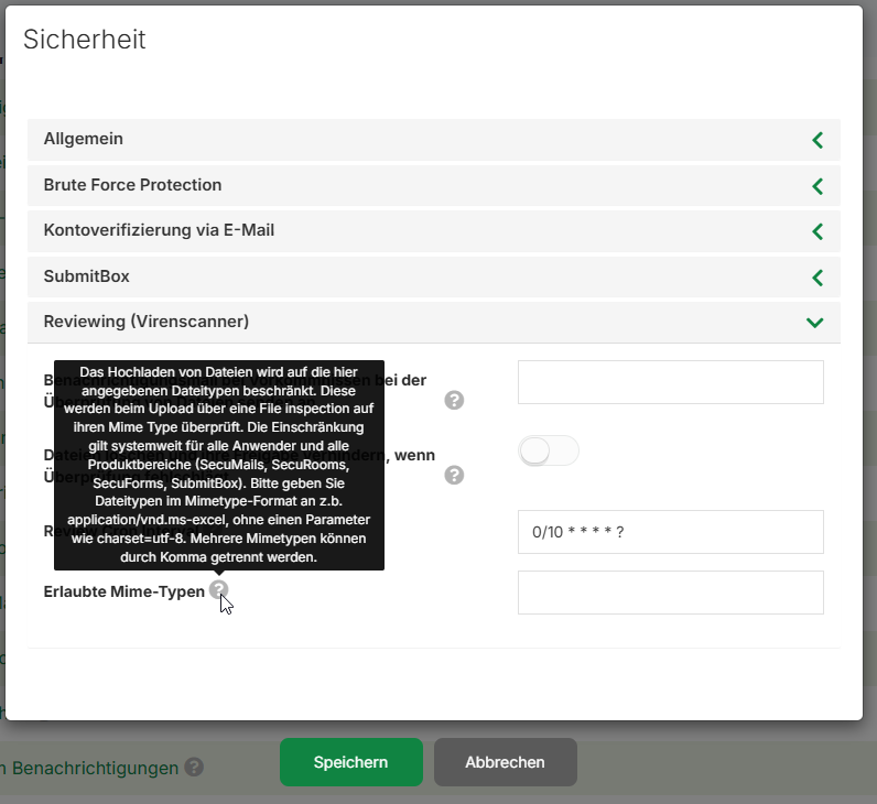 Wenn Sie das Feld leer lassen, findet keine MIME-Type-Prüfung statt. In diesem Fall werden Dateien nur durch den Virenscanner geprüft, jedoch nicht auf ihren Dateityp eingeschränkt. Alle Dateiformate sind dann erlaubt.
