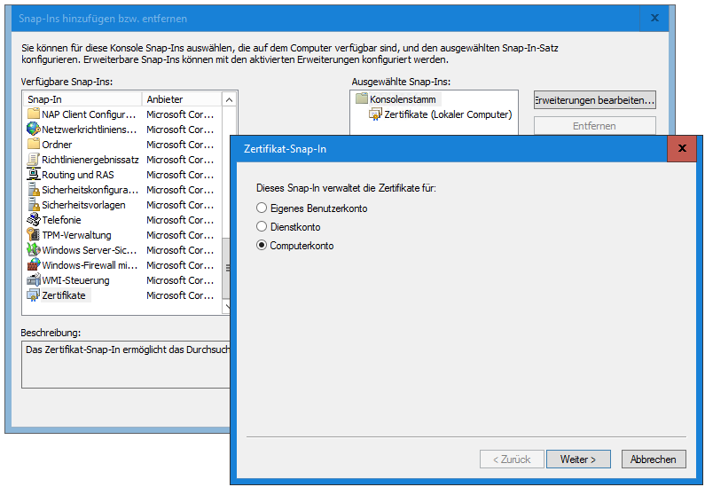- Zertifikatsspeicher öffnen: Öffnen Sie auf dem Domain Controller die Microsoft Management Console (MMC). Fügen Sie das Snap-In "Zertifikate" für das Computerkonto hinzu.