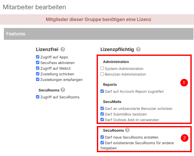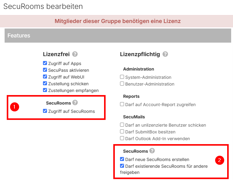 Enthält Ihre Lizenz ausschließlich SecuRoom-Lizenzen, so dürfen in den Gruppen keine lizenzpflichtigen SecuMail-Features aktiviert sein.