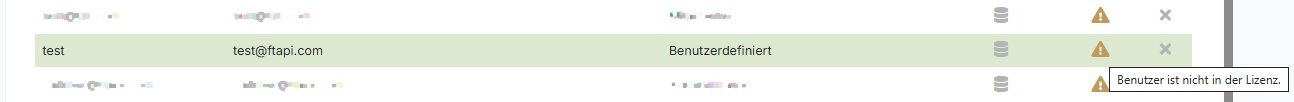 Befinden sich mehr Benutzer in Gruppen mit aktiven lizenzpflichtigen Features, als SecuMail-Lizenzen zur Verfügung stehen, so erhalten die überzähligen Accounts eine 30-Tage gültige Trial-Lizenz. Die Administratoren werden hierüber per E-Mail informiert, das Konto wird in der Benutzerverwaltung wie im folgendem Bild zu sehen dargestellt: