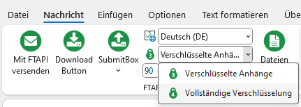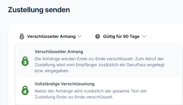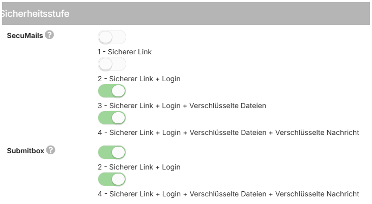 In den SecuMails und im FTAPI Outlook Add-In wird bei Erstellung einer neuen Zustellung jeweils die niedrigste zugelassene Sicherheitsstufe vorausgewählt. Es können vom Benutzer nur die in der Gruppenkonfiguration aktivierten Sicherheitsstufen ausgewählt werden.