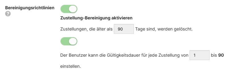 Die Zustellungs-Bereinigung wird auf Gruppenebene konfiguriert und löscht Zustellungen automatisch nach Ablauf der Gültigkeit in der Folgenacht.