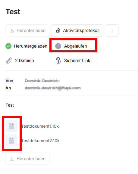 Eine abgelaufene Zustellung ist weiterhin in den SecuMails unter "Gesendet" zu finden, die angehängten Dateien wurden jedoch bereits vom Server gelöscht und können nicht mehr heruntergeladen werden (Schaltfläche ist ausgegraut).