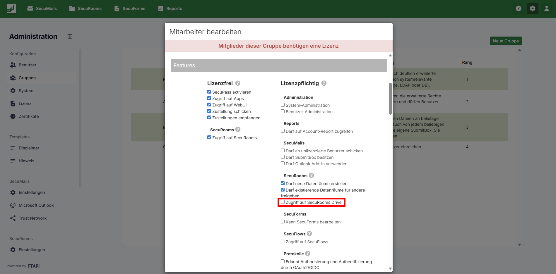 Im Bereich Features wird festgelegt, welche Produkte und Features für die Gruppe und deren Benutzer freigeschalten sind.