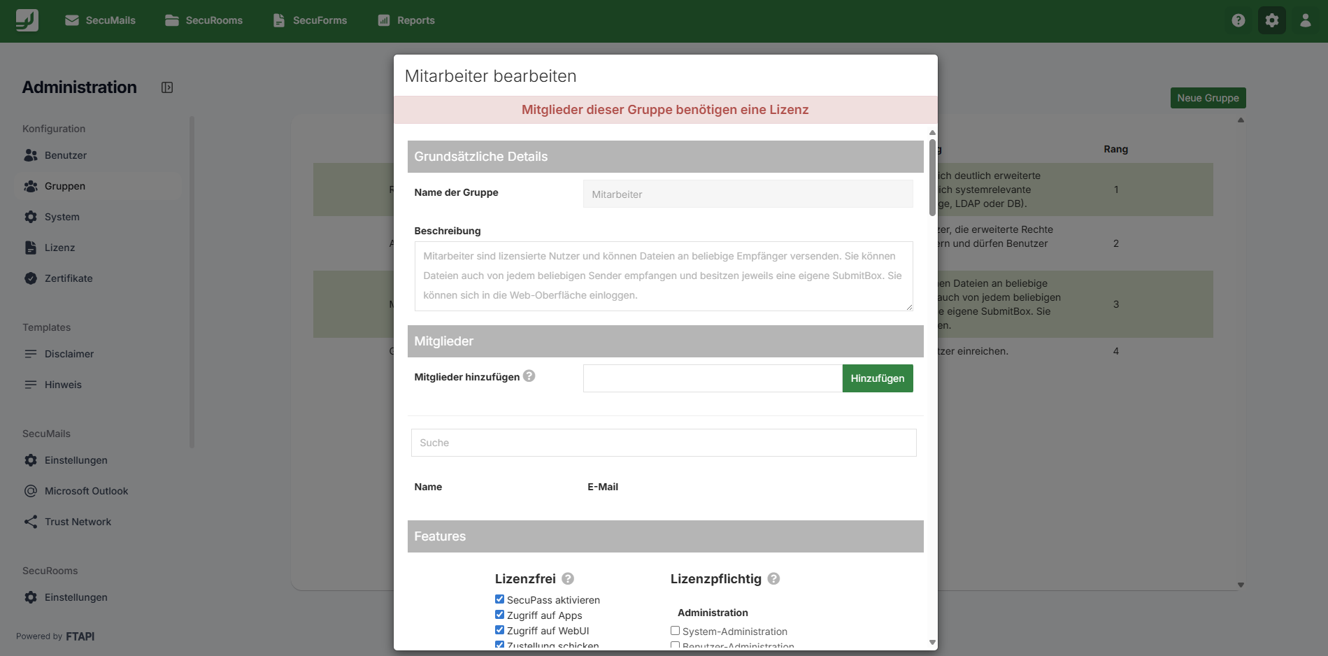 Hinweis: Wenn lizenzpflichtige Features der Gruppe zugeordnet werden, wird für jeden Benutzer der der Gruppe hinzugefügt wird, eine Lizenz fällig.