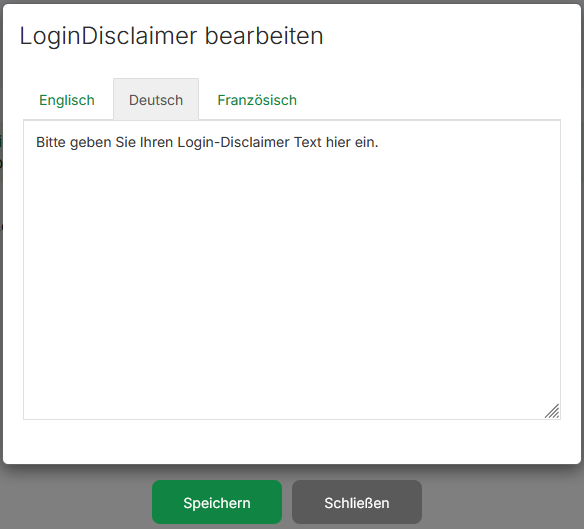 Administration > Templates > Disclaimer > Login Disclaimer. - Geben Sie hier den gewünschten Text für Ihre Nutzungsbedingungen ein.