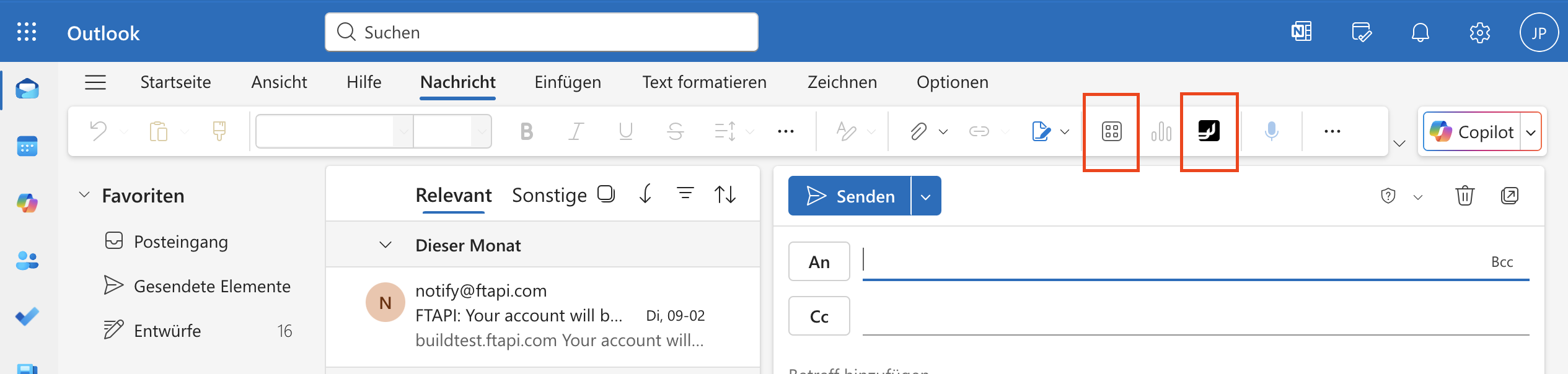 - Apps‑Symbol: Über das Apps‑Symbol in der Symbolleiste → FTAPI SecuMails oder FTAPI Logo.