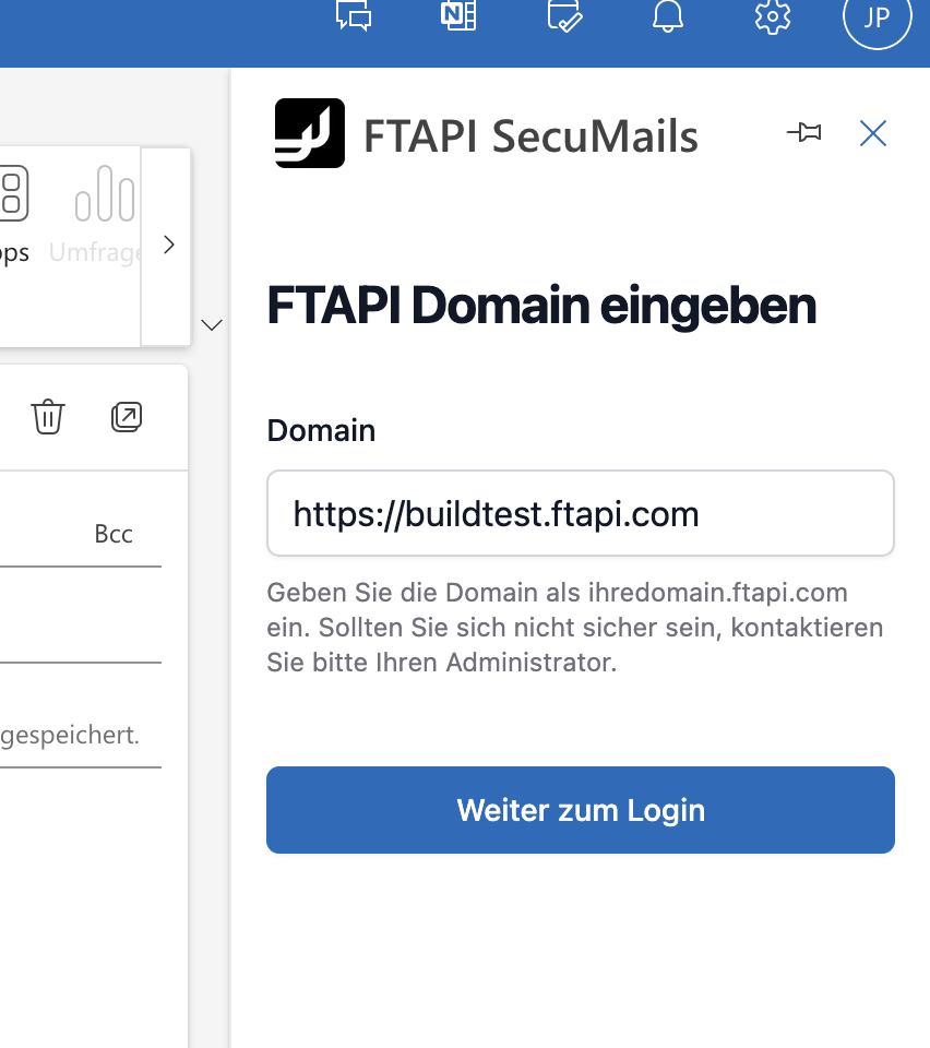 - Menüband (Apps): Im oberen Menüband Apps wählen → FTAPI SecuMails.