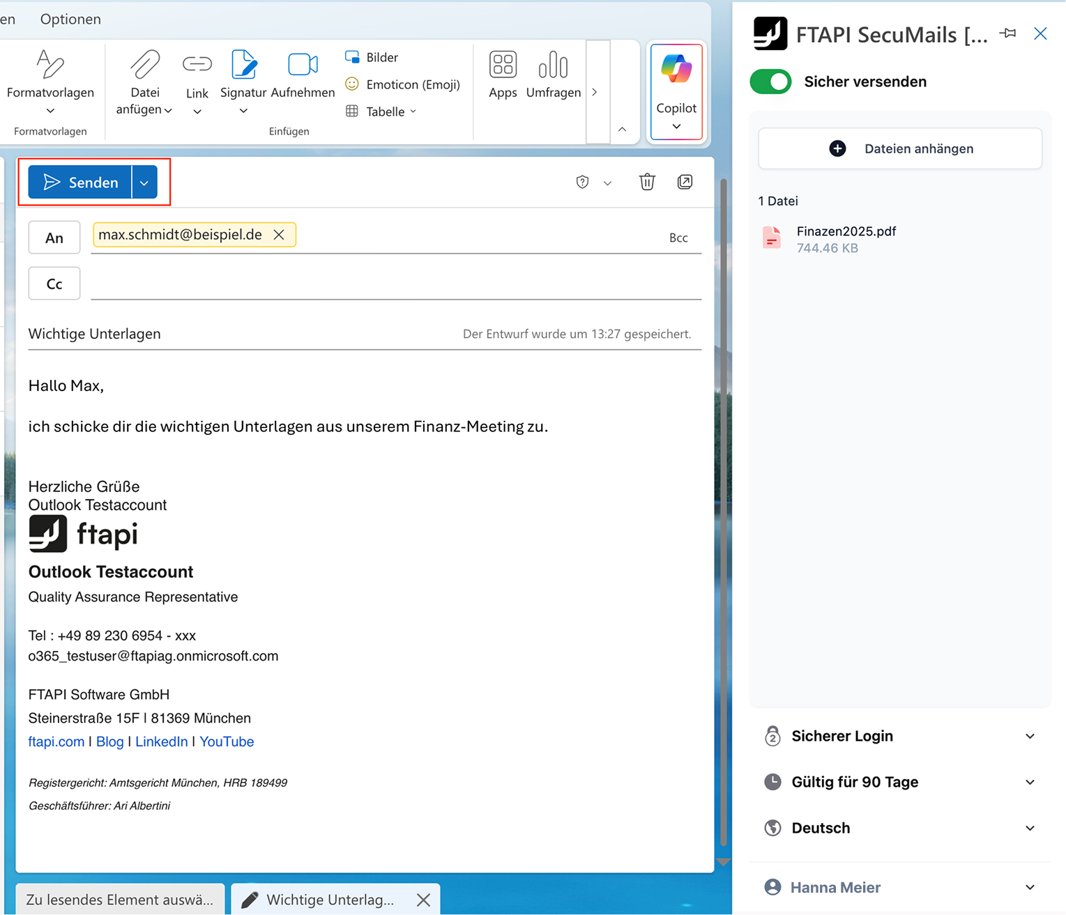 Hängen Sie Dateien wie gewohnt über Datei anfügen oder Drag & Drop in Outlook an. Die Datei wird als Anhang sowohl in der Mail als auch im FTAPI Aufgabenbereich angezeigt.