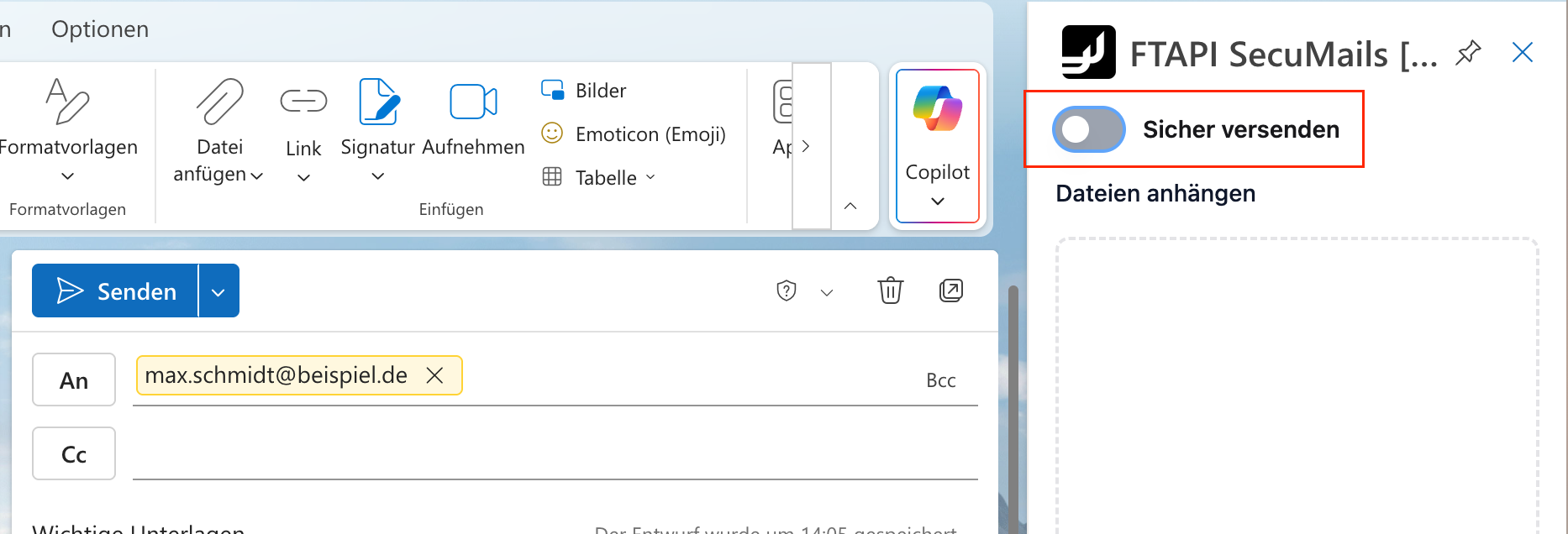 Möchten Sie E-Mails auch öfter ohne FTAPI verschicken, deaktivieren Sie das Add-In einfach mit dem Schalter "Sicher versenden". Wenn dieser Schalter deaktiviert ist, werden Ihre E-Mails nicht über FTAPI verschickt und der Aufgabenbereich bleibt geöffnet.
