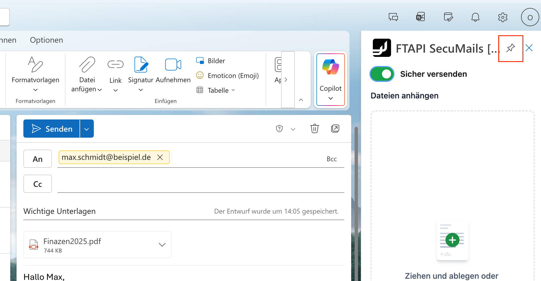 Wenn Sie häufiger E-Mails über das FTAPI Add-In verschicken, können Sie den Aufgabenbereich für einen schnelleren Zugriff anheften. Der Aufgabenbereich bleibt dann automatisch geöffnet, sobald Sie eine neue E-Mail verfassen.