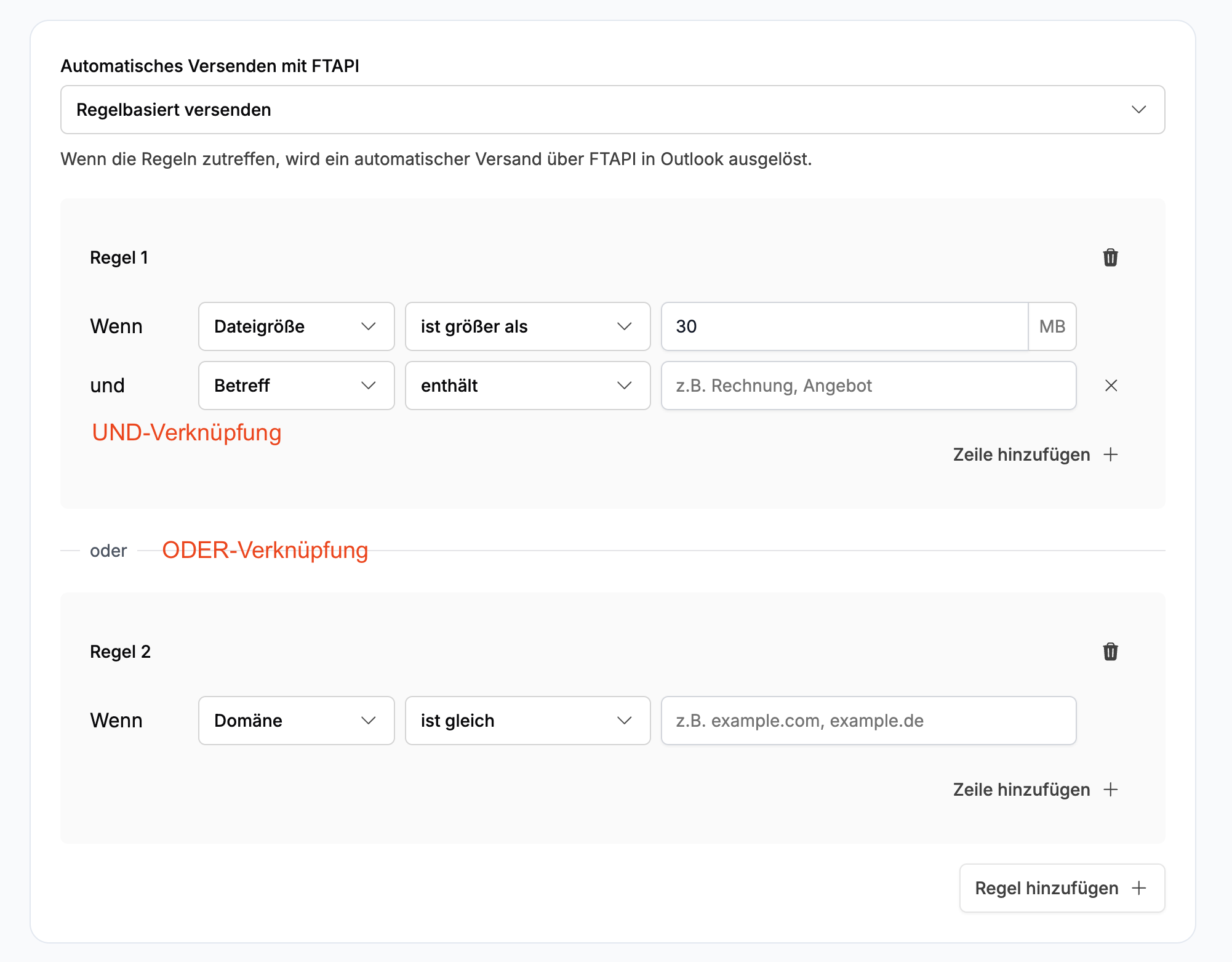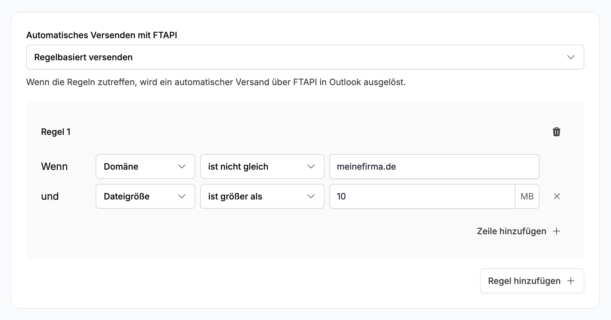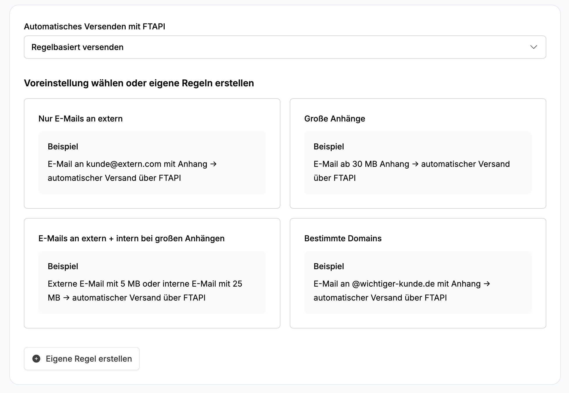 - Wählen Sie im Abschnitt Automatisches Versenden mit FTAPI die Option Regelbasiert.