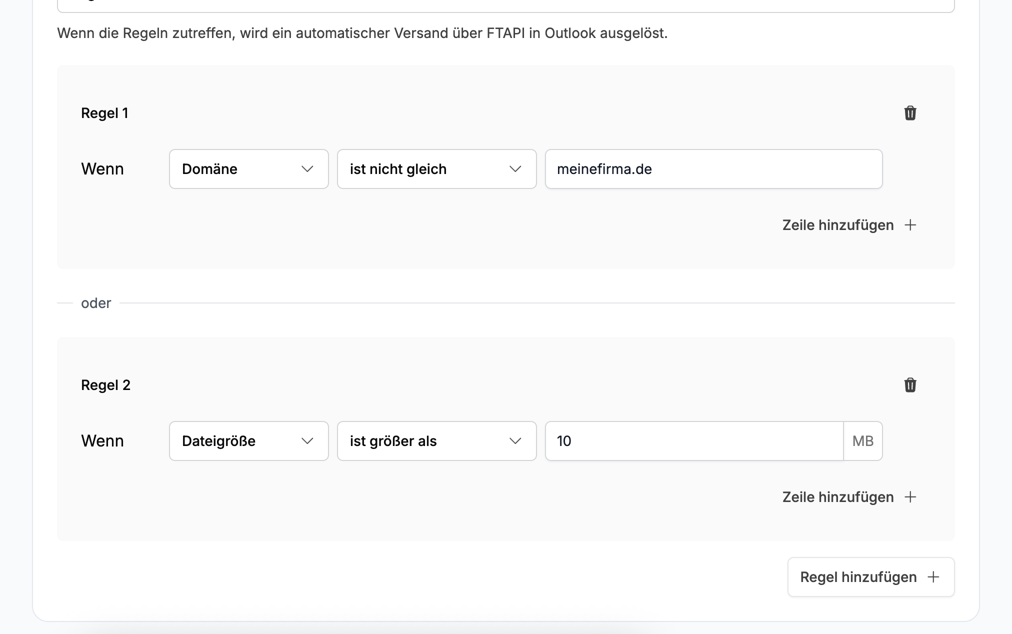 - Interne Kommunikation ausschließen: Mit Domain ist gleich meinefirma.de verhindern Sie automatische FTAPI‑Zustellungen an interne Adressen.