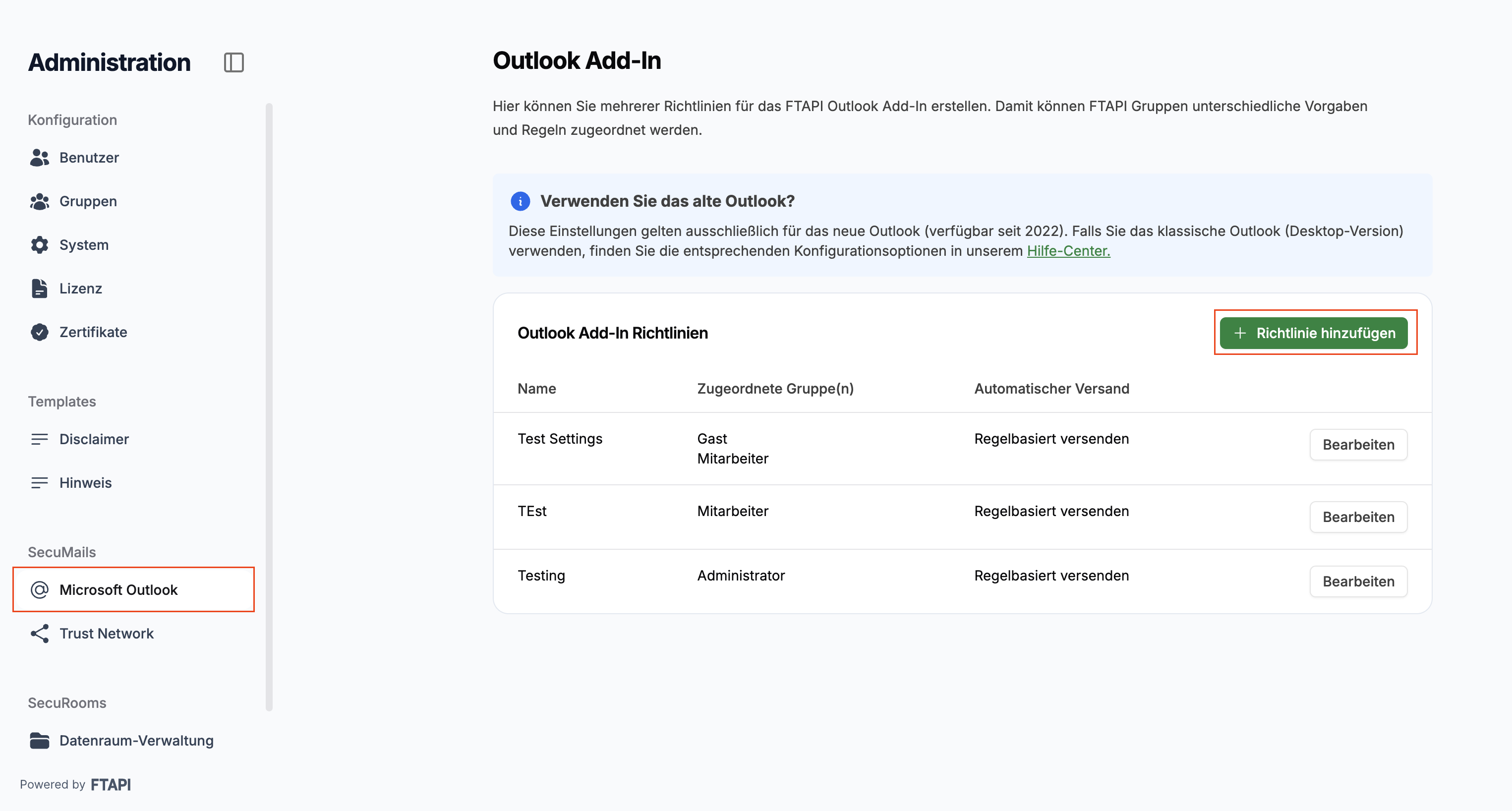 - FTAPI Add‑in für das neue Outlook ist installiert und aktiviert.