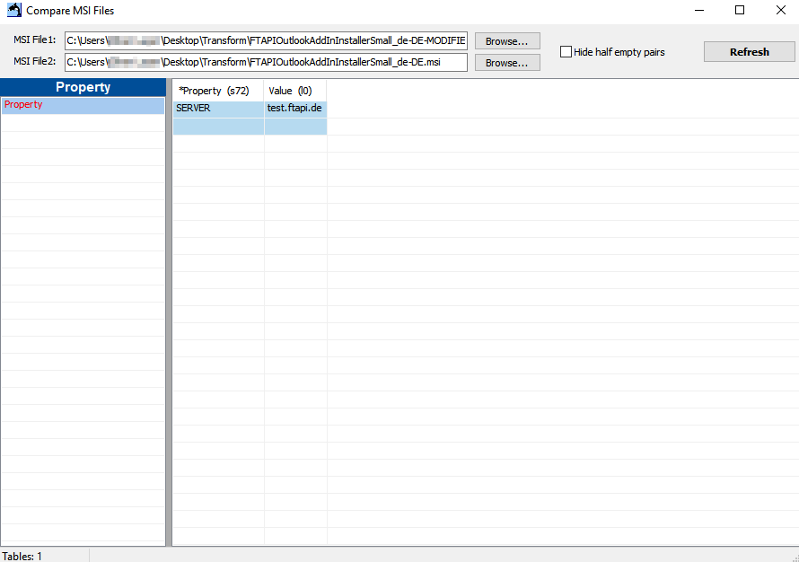 - Menü: Tools -> Compare MSI files (Original-MSI als MSI File 2 wählen).
