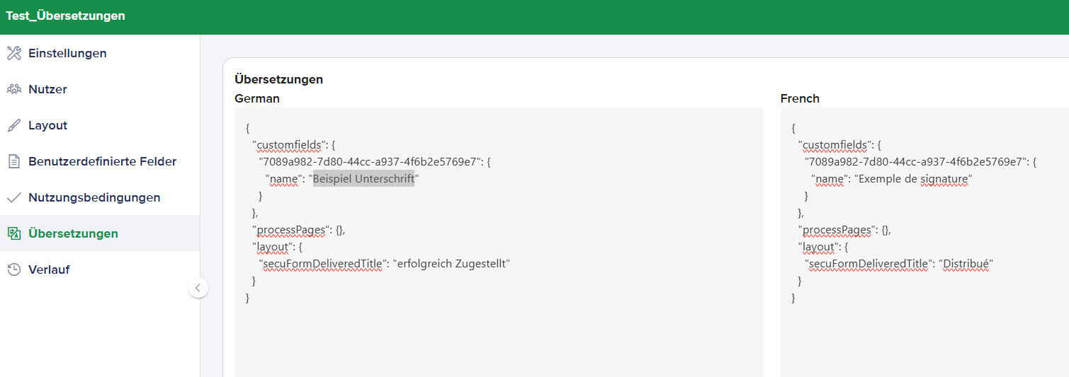 Um Ihren Benutzern je nach Browsereinstellung automatisch die korrekte Sprache (Deutsch oder Französisch) anzuzeigen, können Sie im Reiter "Übersetzungen" spezifische Lokalisierungen hinterlegen. Diese Anpassung erfolgt direkt im JSON-Code des Formulars.