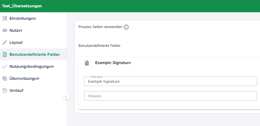 Sie möchten das Feld "Example Signature" ins Deutsche übersetzen ("Beispiel Unterschrift").